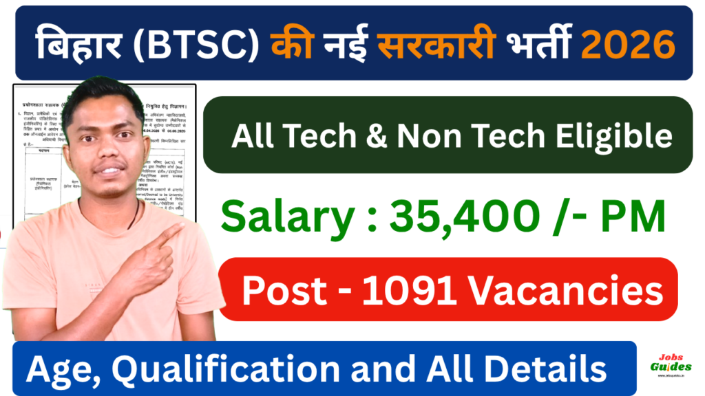 Bihar government job seekers, here is a golden opportunity you simply cannot afford to miss! The Bihar Technical Service Commission (BTSC) has officially released the BTSC Laboratory Assistant Recruitment 2026 notification for a massive 1091 vacancies across multiple engineering and science disciplines. If you hold a Diploma, B.E., B.Tech, or B.Sc degree in a relevant field, this is your chance to land a secure Bihar Govt Jobs 2026 with a handsome pay scale. The online application window is open right now — don’t let it slip away! Jobs Guides brings you all the verified details straight from the official notification so you can apply with full confidence.